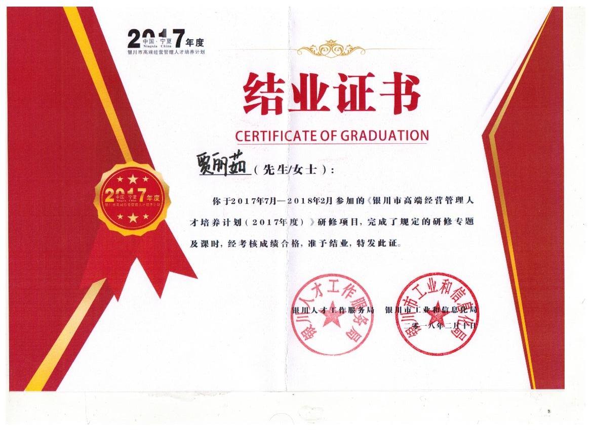 賈麗茹銀川市高端經營管理人才培養計劃(2017年度)結業