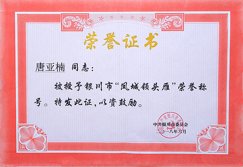 唐亞楠被授予銀川市“鳳城領(lǐng)頭雁”榮譽(yù)稱號(hào)